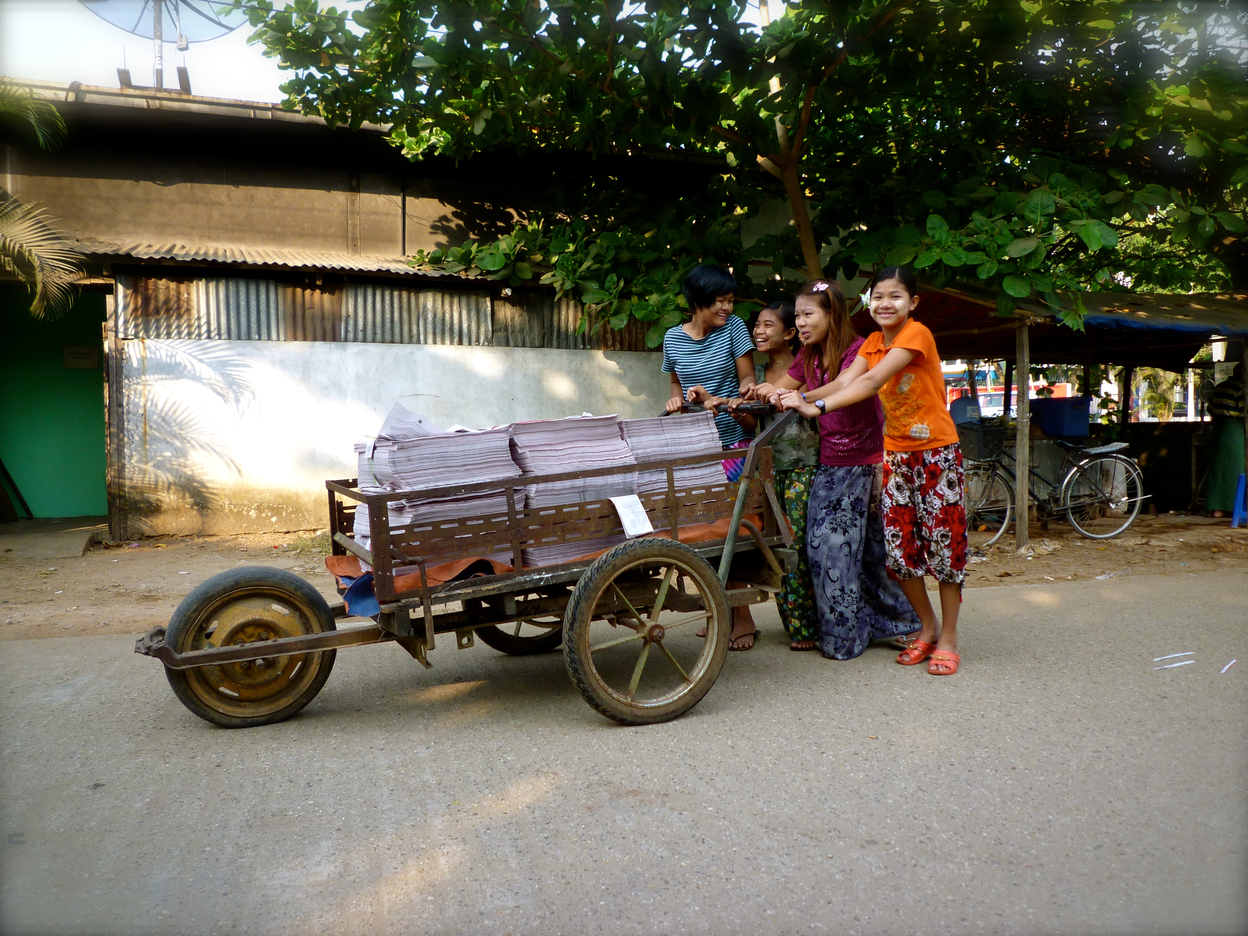 Girls delivering newspapers – it takes all four of them to make the cart go around corners as it is seriously heavy